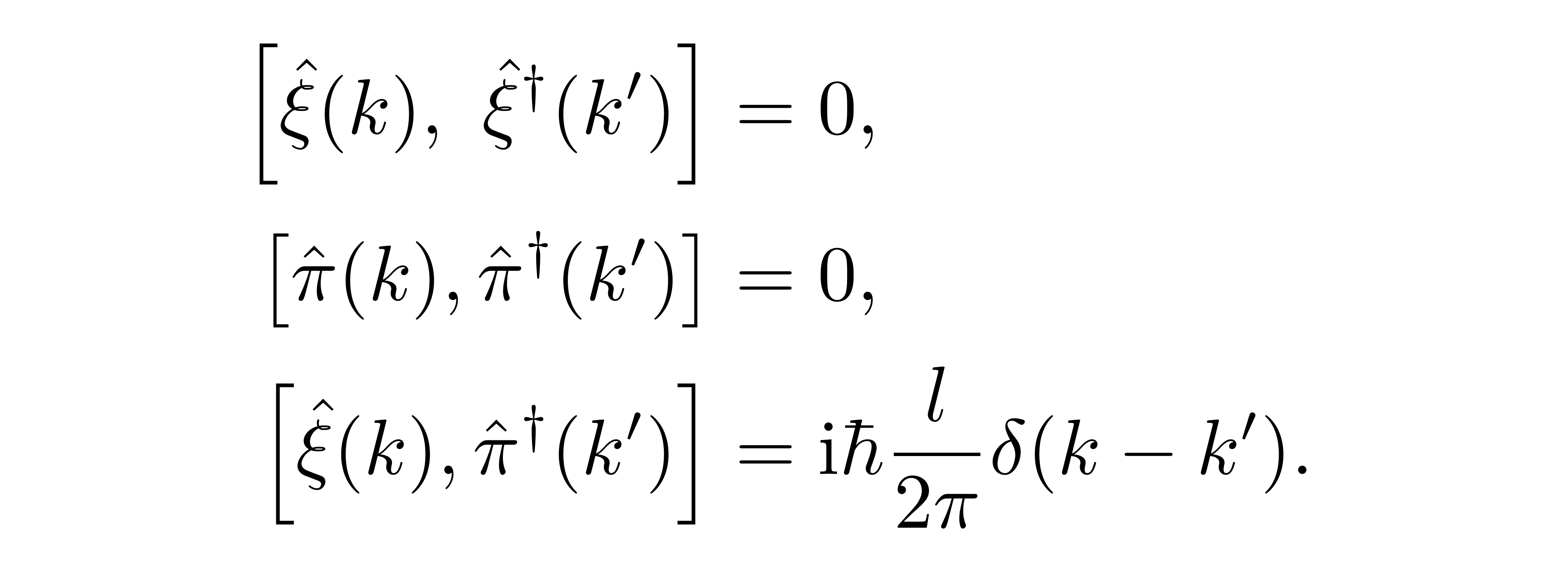 最后一个对应关系提出,当且仅当 k 与 k' 一致时,“坐标” ξ 与对应的“动量” π 不对易,且正则对易结果正比于 iℏ。这样一个对易关系,与相应的哈密顿量(密度)h(k) 的定义一齐提示我们,类似于经典谐振子的情形,一维量子谐振子链的哈密顿量也可以被分解为若干个以参数 k 标记的,独立振动的谐振子的叠加。每个独立谐振子分量有独立的振荡频率,或者说能级间隔,由色散关系 (2) 给出。回忆对单个谐振子的量子化,可以预期对每个给定的 k 模式,我们都可以通过组合 ξ 与 π 定义相应的升降算符,且预期可以给出相应的能谱