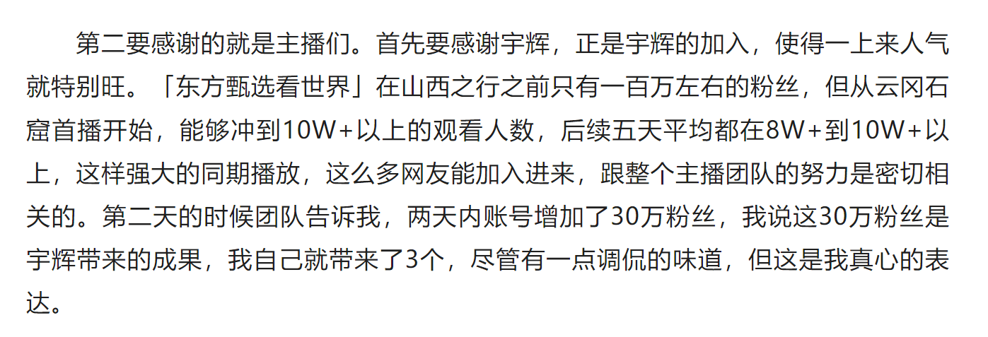 从去年开始,“东方甄选看世界”就推出了“黑龙江行”、“云游西北”、“齐鲁山海行”等专场直播。俞敏洪6月在个人公众号中提到,西安之行为东方甄选看世界账号增加了30万粉丝。“从云冈石窟首播开始,东方甄选看世界的直播能够达到10W+以上的观看人数,后续五天平均都在8W+到10W+以上。”