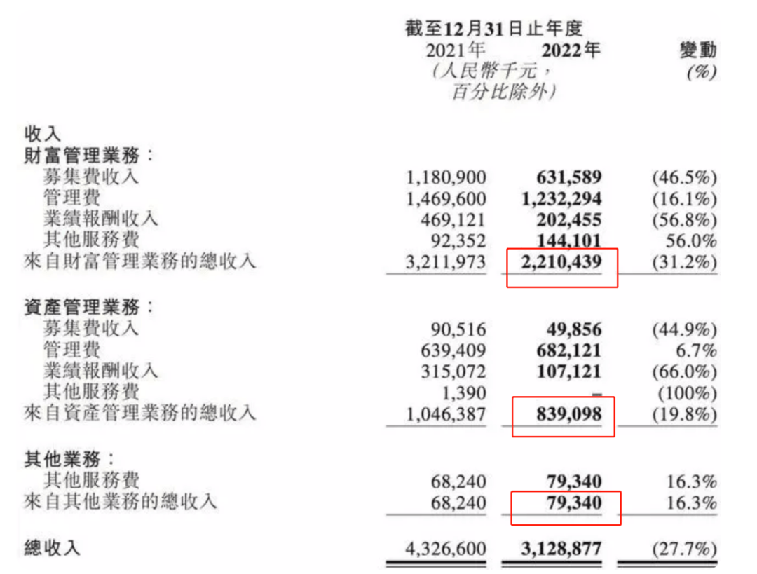 2022年,受困于整体营收的下滑,诺亚财富的财富管理板块下滑明显,该板块总营收为22.10亿元,较2021年同期的32.12亿元减少31.2%;资产管理板块收入8.39亿元,较2021年同期的10.46亿元减少19.8%;其他业务收入7934.0万元,同比增长16.3%。但其他业务板块基数较小,其增幅远没有覆盖到另外两大主营业务板块的跌幅。因为其他两大主营业务才是诺亚财富赚钱的关键。