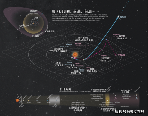 [图解:(最上方小体字)发射于1977年,旅行者们已经完成了外行星的旅程(图中央),现在正在前往星际空间(图底)。旅行者一号正在离开日球层,这是指太空中受太阳气体及磁场影响的区域,距离太阳190亿千米(图左)。