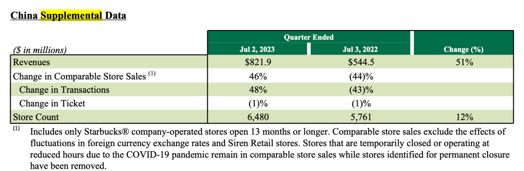 根据财报显示,星巴克第三财季(4月3日—7月2日)净收入达到8.219亿美元(约合59.6亿元人民币),同比增长60%(去除汇率变动影响),较上一季度增长10%。同店销售额增长46%,同店交易量增长48%,平均客单价下降1%。