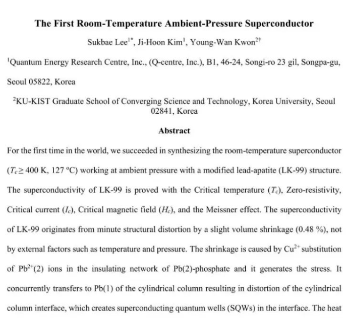 事件起因是韩国的物理学家团队,上传了两篇论文,宣称发现了首个室温常压下的超导体。