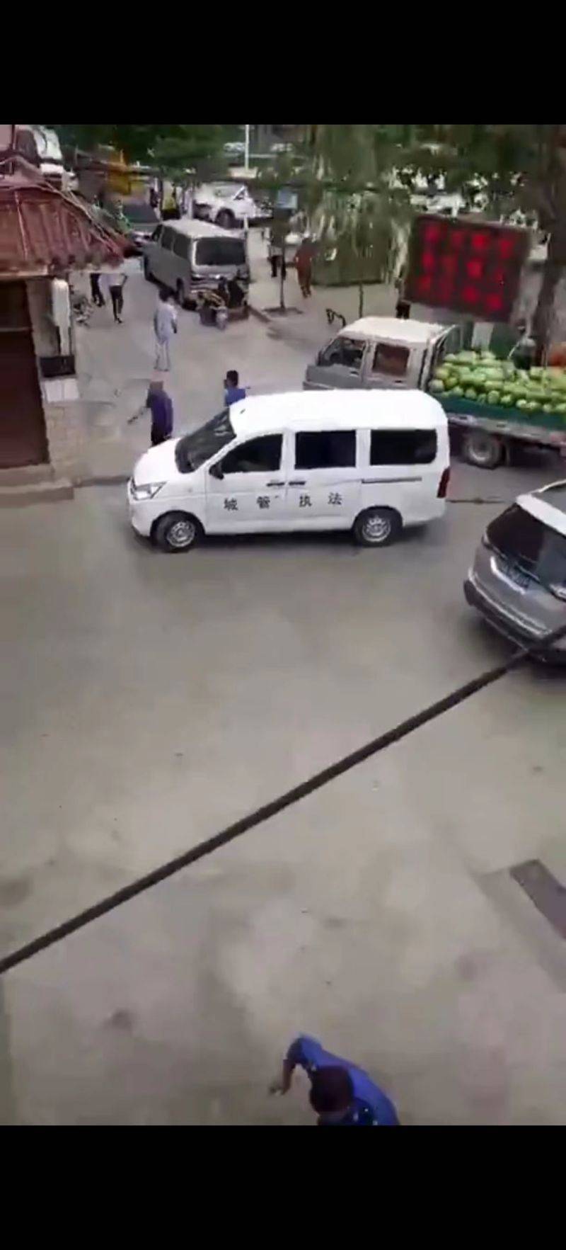 案发现场王氏父子三人的瓜车和城管执法车辆。受访者供图