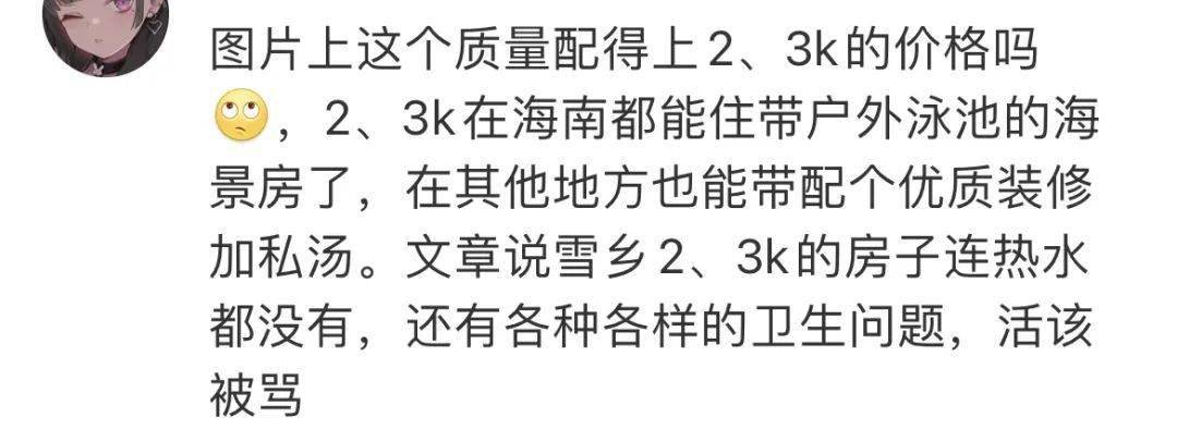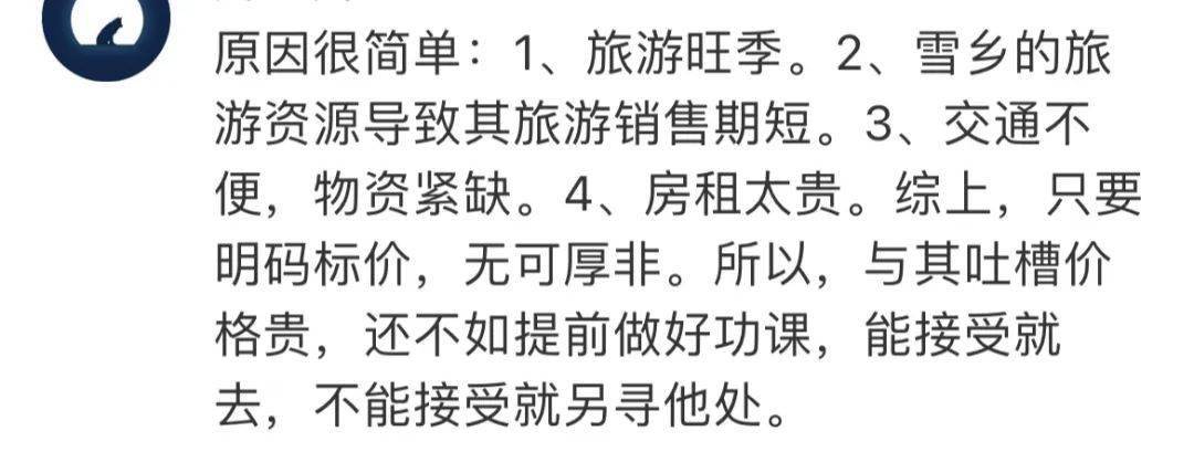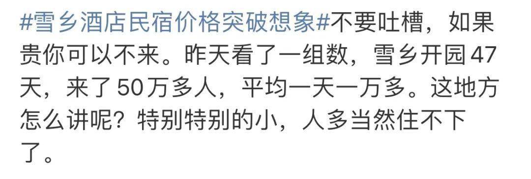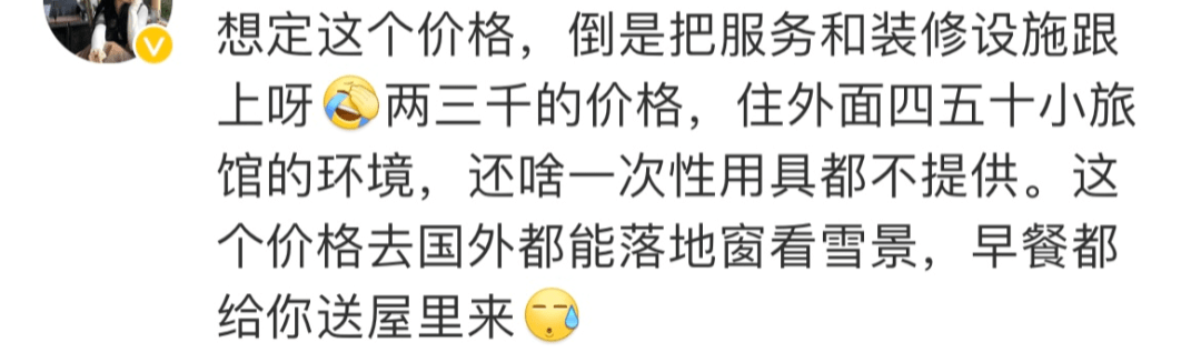 还有网友表示价格贵不是最主要的,重点是这么高的价格没有匹配的服务。两三千元的价格在海南这能住带户外泳池的海景房了,而在雪乡这个价格却是小旅馆的环境,连热水都没有,还有各种各样的卫生问题。