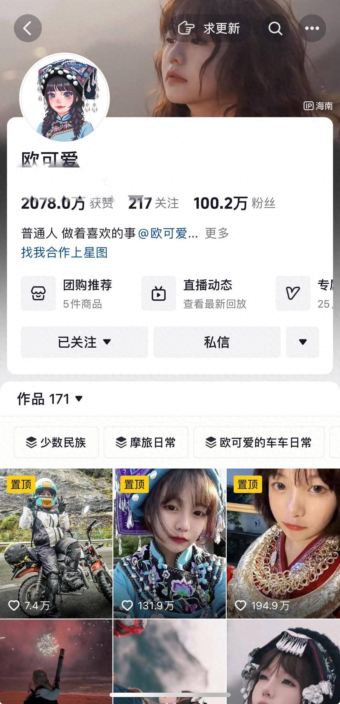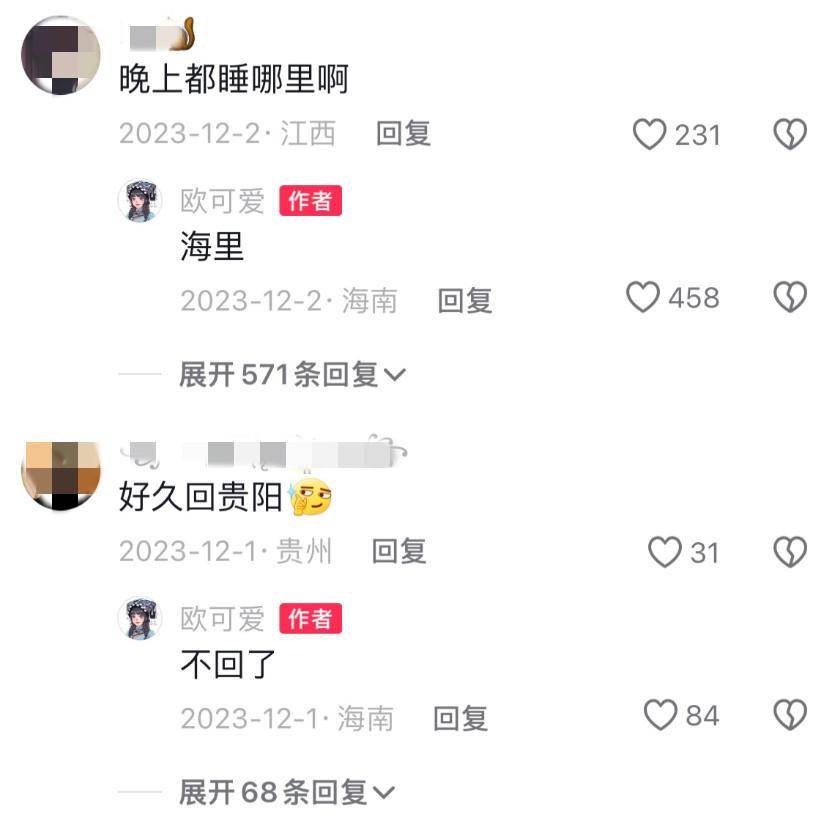 红星新闻注意到,“欧可爱”在其账号简介处写着“普通人,做着喜欢的事”。她的账号发布的视频显示,她身材娇小,喜欢机车和旅行,还经常穿各式民族服饰。2023年12月27日,“欧可爱”晒出她的登机牌,并分享她到海南万宁日月湾游玩的视频。