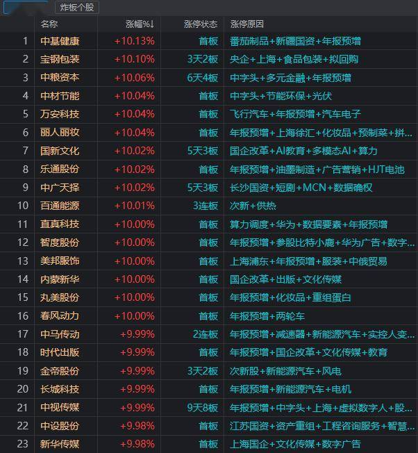 此外,春风动力、时代出版、长城科技等业绩预增个股,以及丽人丽妆、乐通股份、美邦服饰、智度股份等扭亏为盈的公司,也纷纷涨停。