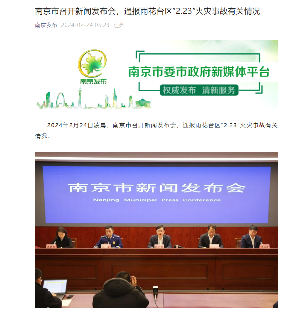 据央视新闻,2月24日凌晨,江苏省南京市召开新闻发布会,通报南京雨花台区“2·23”火灾事故有关情况。截至23日24时,事故共造成15人遇难,44人在院治疗,其中,1人危重,1人重症,42人伤情较轻。