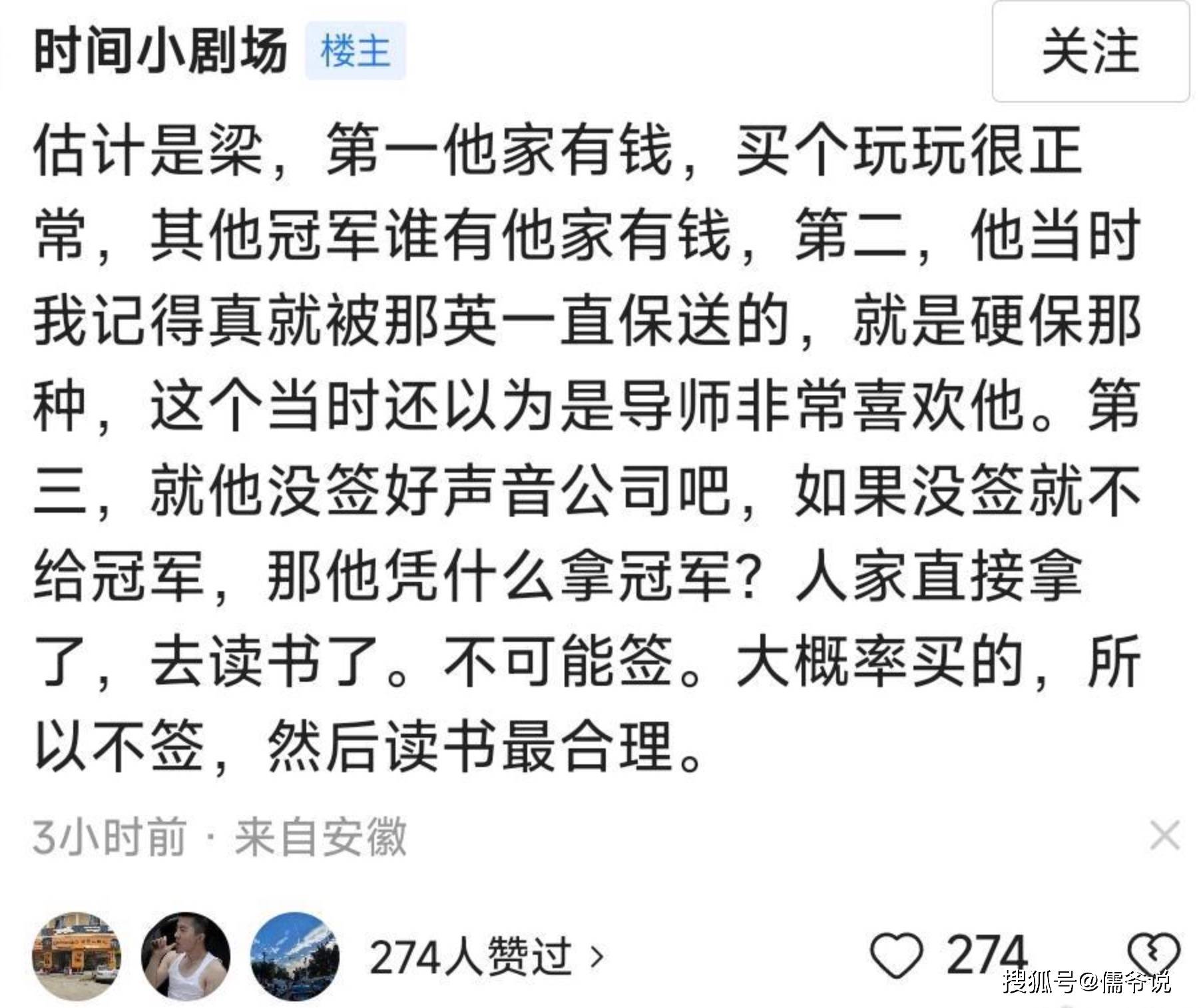 有网友猜测这位花钱买冠军的可能是第一季的冠军梁博和第二季的冠军李琦。