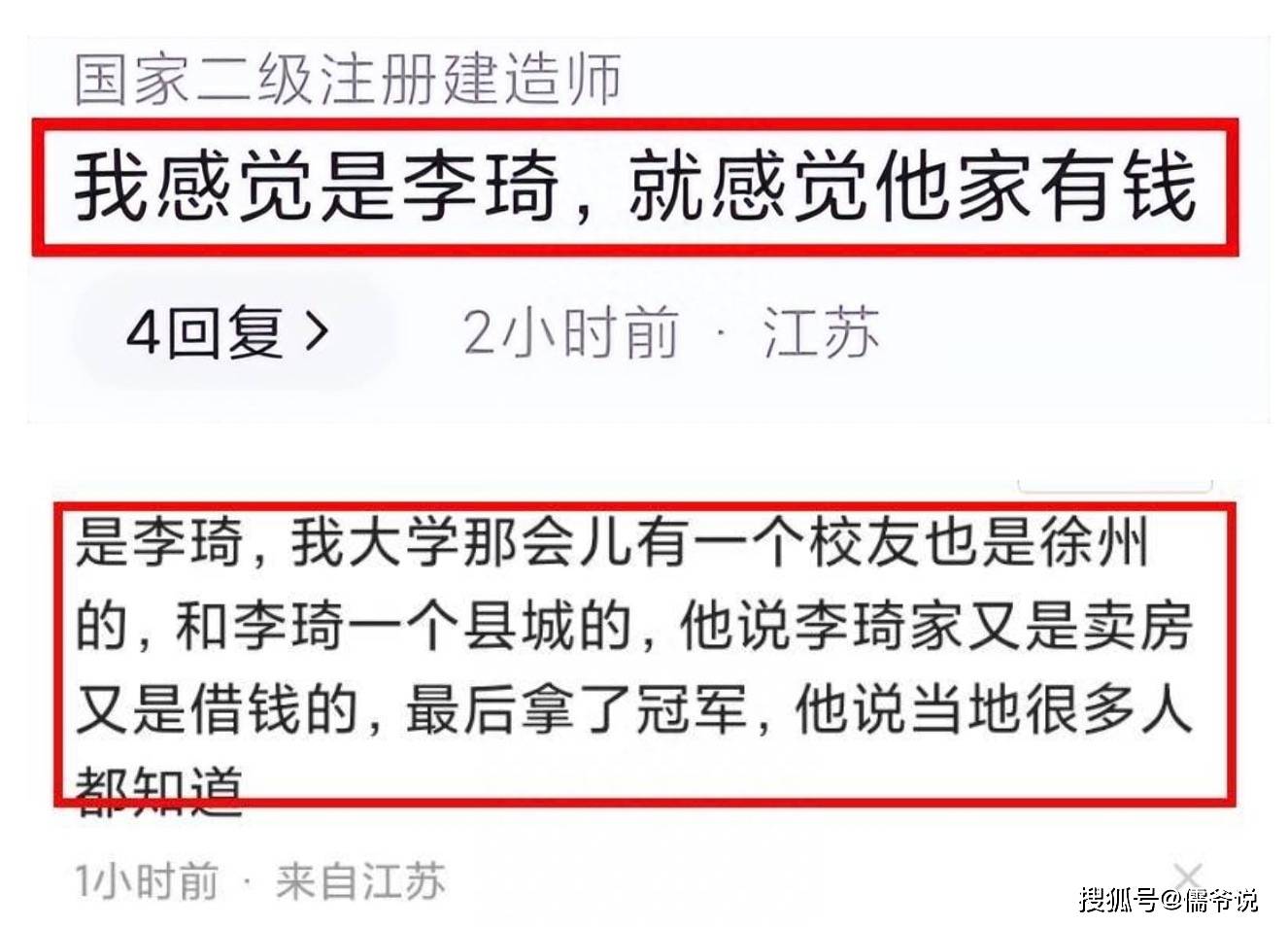 而对于李琦的说法,同样也和梁博差不多,也是说他家很有钱。不过传闻比梁博的更为离谱些,有自称和李琦一个县城的网友表示,李琦当年为了拿下好声音的冠军,又是卖房又是借钱,此事在当地可以说是家喻户晓的事情。如果这个说法是真的话,那么似乎李琦的可能性更大些了。