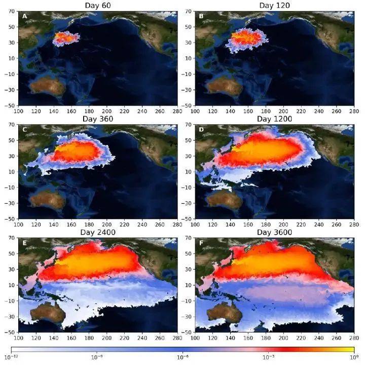 1200 天后,核污水将覆盖几乎整个北太平洋;而 10 年后,全球海域都会受到污染。