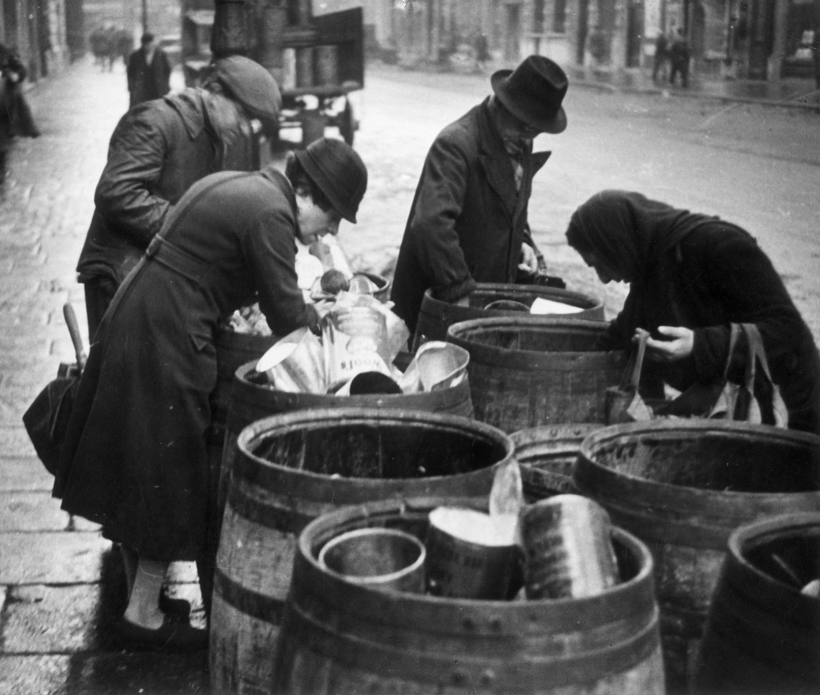 1945年2月,被德国占领的法国地区,女人在街上桶里找食物。