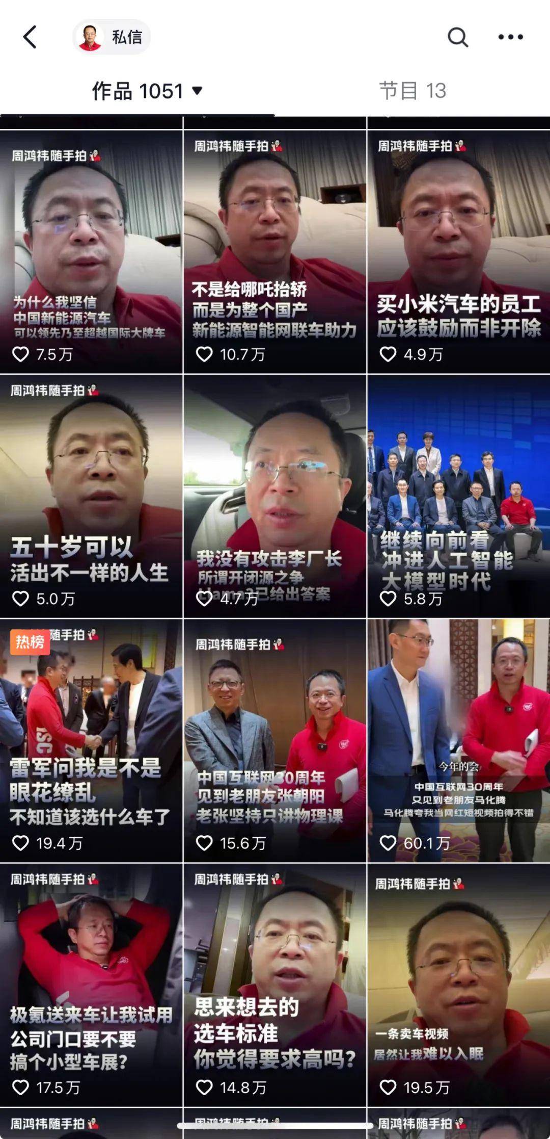 随后,周鸿祎有关汽车的视频越发越多。但彼时或许也没人能想到,汽车圈的一半流量,会被没有驾照的这位互联网老人分走。