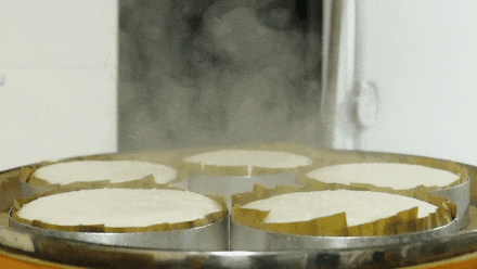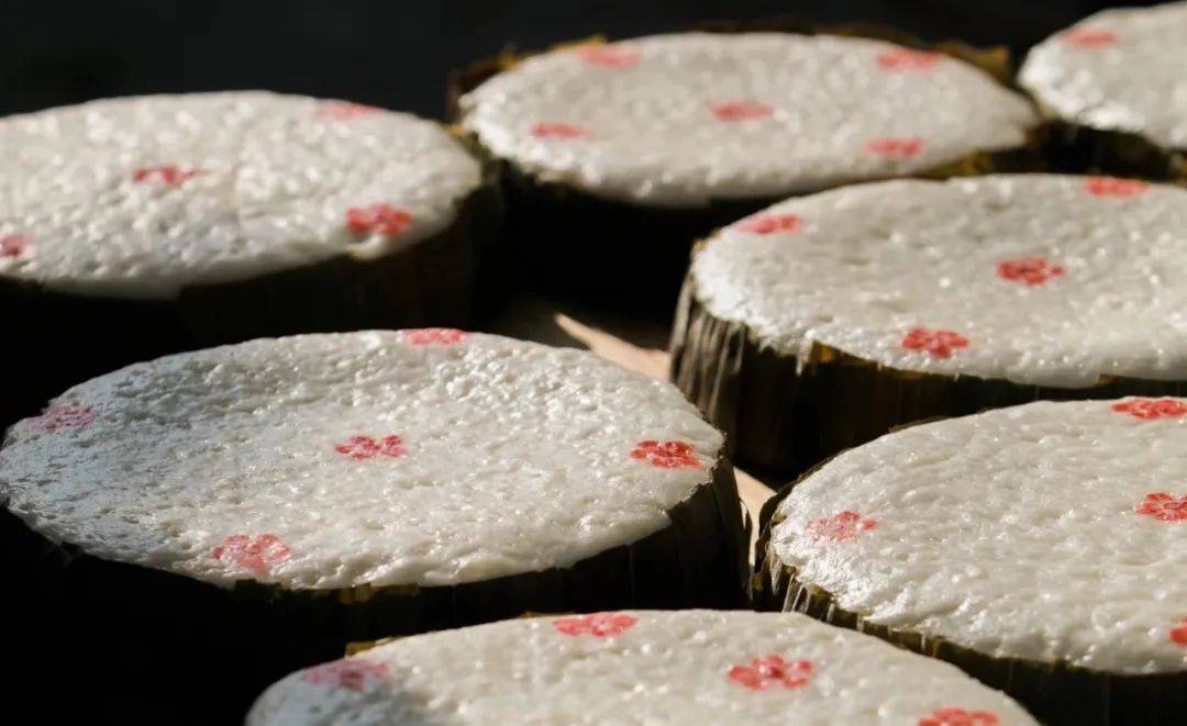发糕口感滋润的秘诀在猪油。“我每天一大早都会去集市买最新鲜的猪油,油好味才佳。”再将猪油与糯米粉、粳米、白砂糖、酒酿等原料按比例混合,倒入锅中,充分搅拌,直至成团。经过4-5个小时的静置发酵,发糕变得更加松软,一个多小时的大火蒸制后,发糕方可出炉,再点上独有的梅花花印,更显“年年发、步步高”的吉祥之意。